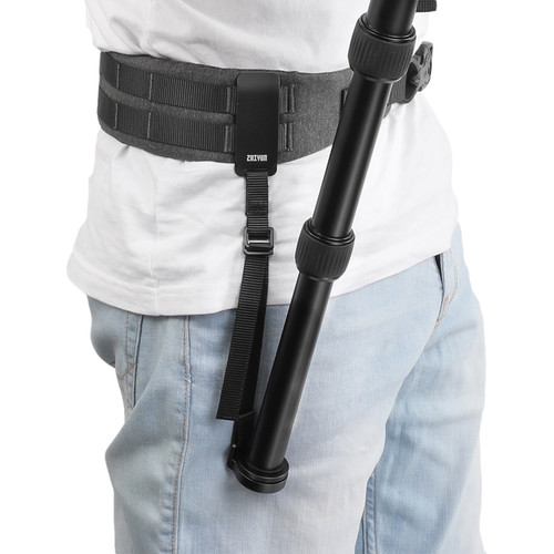 Para asegurar el monópode, el cinturón cuenta con un receptáculo suspendido de una correa colgante. El receptáculo tiene una plataforma de montaje de liberación rápida extraíble de 1/4″-20 que se enrosca en la parte inferior del monópode y luego se coloca y se quita del receptáculo mediante la función de liberación rápida. Dos pasadores de registro en el receptáculo se bloquean en una ranura en la plataforma de montaje de 1/4″-20 para bloquear los dos juntos.