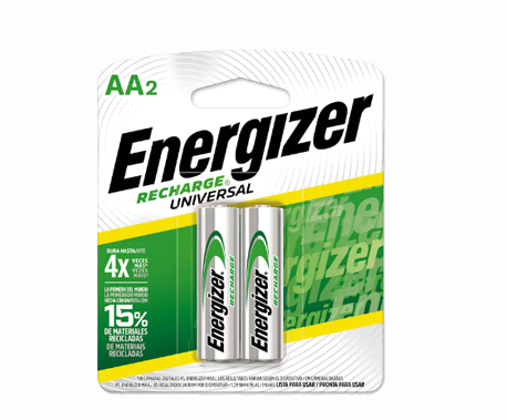 Tus dispositivos favoritos nunca se toman un descanso. Por eso, las pilas AA Energizer Recharge® Universal son la manera perfecta de dar energía a esos dispositivos que necesitan cargas frecuentes. Desde juguetes y cámaras digitales, hasta dispositivos GPS portátiles, consolas de juego inalámbricas y reproductores MP3, las pilas AA Energizer Recharge® Universal mantienen tus dispositivos en funcionamiento. Las pilas AA Energizer Recharge® Universal te brindan más energía ahora con un 15% de materiales reciclados y mantienen su carga durante un máximo de 1 año.
