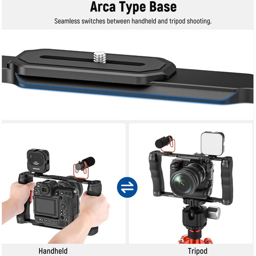 La jaula universal para cámara es una solución versátil y robusta compatible con una amplia gama de modelos de Canon, Sony, Nikon, Fujifilm, Lumix y Blackmagic, entre otros. Diseñada para adaptarse a cámaras sin lentes con anillo de montaje para trípode, esta jaula incorpora una placa de liberación rápida tipo Arca que permite montar y desmontar la cámara de forma ágil y segura, con un botón de liberación que previene caídas accidentales. Su estructura de aleación de aluminio ligera pero resistente incluye dos asas contorneadas de silicona que proporcionan un agarre cómodo y firme para una grabación estable sin necesidad de trípode. Compatible con múltiples sistemas de montaje como trípodes NEEWER, cabezales de bola y la placa base SR006, también se integra perfectamente con accesorios de SmallRig. Además, cuenta con numerosos puntos de montaje, incluidos orificios roscados de 1/4″ y 3/8″ con localizadores ARRI, zapatas frías y un riel NATO, lo que permite incorporar fácilmente diversos accesorios como asas superiores, soportes para monitores, micrófonos y luces LED para potenciar tus producciones audiovisuales.