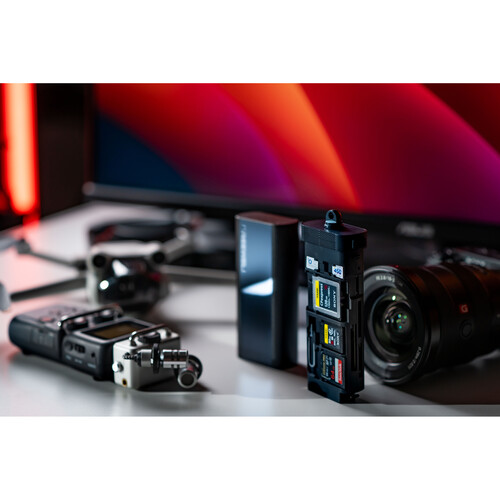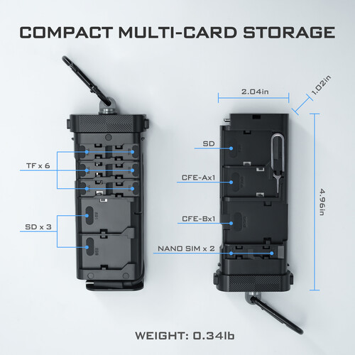 Transporta tarjetas de memoria y transfiere datos a velocidades de hasta 1000 MB/s usando el lector de tarjetas Duo de Freewell , que cuenta con una ranura para tarjetas UHS-II SDXC y una ranura para tarjetas UHS-II microSDXC. También hay espacio para almacenar una tarjeta CFexpress Tipo B, una tarjeta CFexpress Tipo A, tres tarjetas SD, seis tarjetas microSD y dos tarjetas nano SIM. Construido con aleación de aluminio, es compatible plug-and-play con Windows, Mac, Linux, Android, iPadOS y más usando un cable USB-C 3.2 Gen 2 de 10 Gb/s integrado. Además, ambas ranuras para tarjetas se pueden usar simultáneamente. Se incluye un mosquetón, un adaptador USB-C a USB-A de 10 Gb/s y un pin de expulsión.