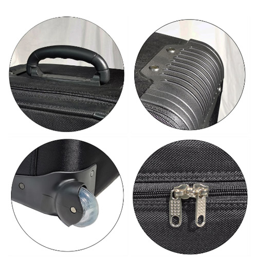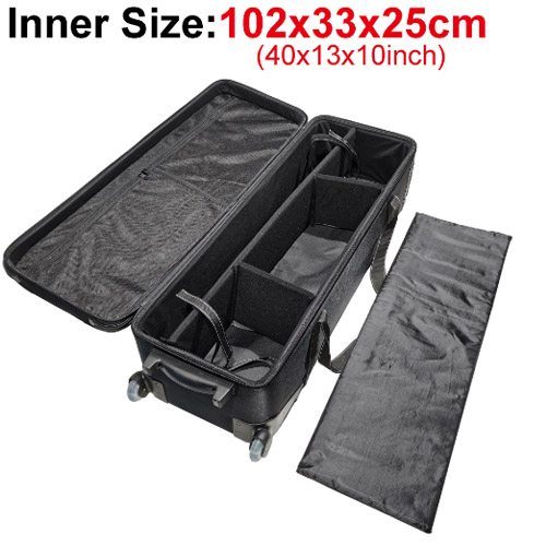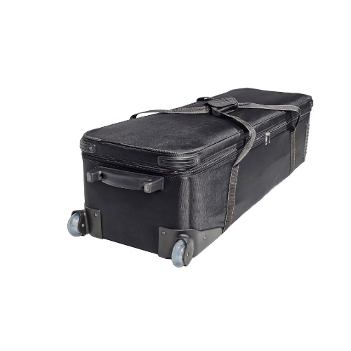Con sus medidas de 102 x 32 x 25 cm, sus ruedas y manija, es ideal para transportar hasta juegos de luces pequeños, incluidos pedestales y sombrillas.