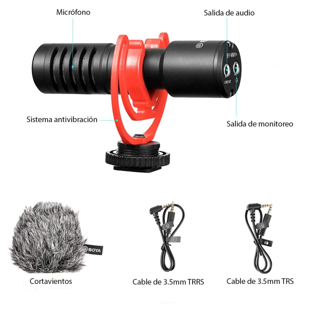 Micrófono condensador compacto tipo cañón super cardioide Boya BY-MM1+, para cámaras, celulares, tabletas, videocámaras y más.