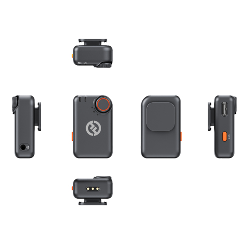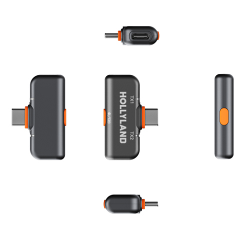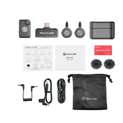 Graba hasta dos personas en aplicaciones de periodismo móvil o creación de contenido con el sistema inalámbrico LARK M2S de Hollyland. Este conjunto incluye dos transmisores ultracompactos con micrófonos omnidireccionales integrados para una grabación discreta, un receptor USB-C que se conecta directamente a dispositivos móviles, un receptor para cámaras, un cable adaptador de USB-C a Lightning, y un estuche de carga. Los transmisores, con un diseño de clip de titanio para sujetarlos de manera segura, tienen una apariencia discreta sin logotipos visibles.