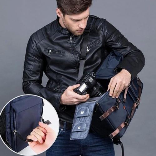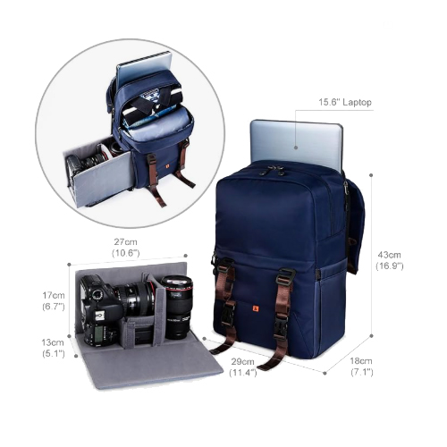 Mochila K&F azul . Podrás llevar todo lo que necesitas. En el compartimento superior guarda tus artículos personales, mientras que en el inferior puedes llevar una cámara, 4 lentes y otros accesorios. Además, cuenta con acceso lateral y posterior para una rápida obtención de tu equipo. Fabricada con materiales de calidad, es resistente al agua y ofrece una protección óptima. Su diseño ergonómico y transpirable te brinda comodidad en tus viajes. ¡Esta mochila está diseñada pensando en tus necesidades como fotógrafo!