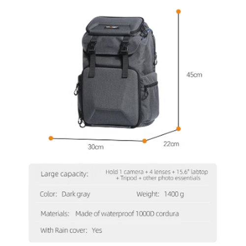 Sus dos compartimientos principales son resistentes a impactos, e incluyen divisores removibles. El compartimiento inferior, ideal para cámaras y lentes. El central ideal para drones y accesorios. El tercer compartimiento superior es ideal para baterías, memorias y cables. Posee 2 compartimientos adicionales laterales, cerrados por cierre, y el sistema de tirantes externos le permiten transportar trípodes grandes.
