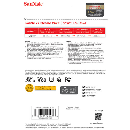 Diseñada para condiciones extremas, la tarjeta de memoria SDXC Extreme PRO UHS-II de 128 GB de SanDisk está protegida contra el agua, las temperaturas extremas, la humedad, el desgaste, los golpes, las caídas, los rayos X y los imanes. También cuenta con un interruptor de protección contra escritura integrado que ayuda a proteger el contenido para que no se borre.