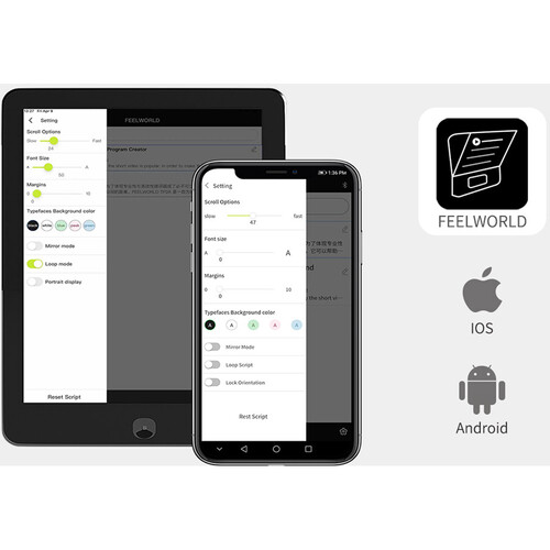 Su control remoto Bluetooth se conecta a Android e iOS, y puede ser utilizado con aplicaciones comerciales de Teleprompter, aunque Feelworld ofrece la suya propia.