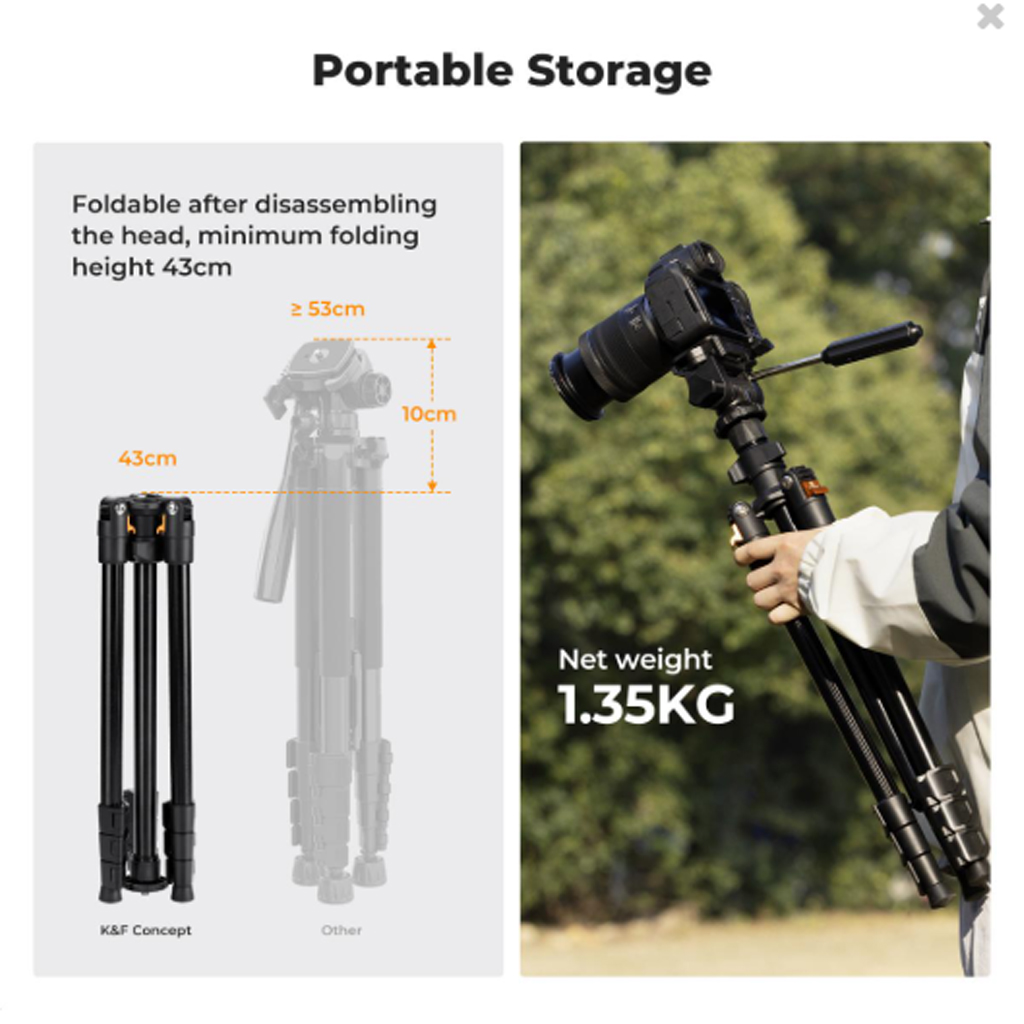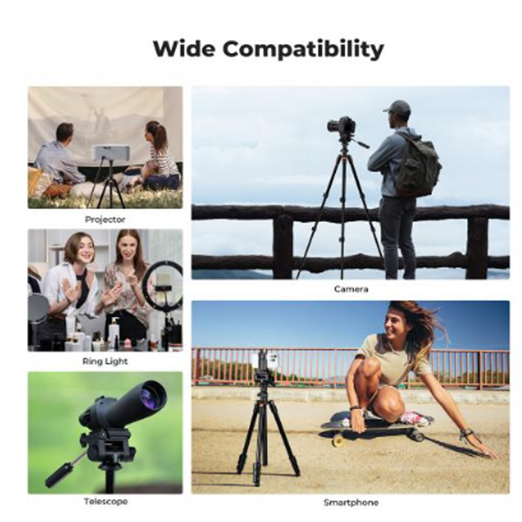 - Práctico y portátil: Este trípode combina funcionalidad y portabilidad. Con un diseño de patas de 4 secciones, alcanza una altura máxima de 196 cm. Tras desmontar el cabezal, se pliega y su tamaño plegado es de tan solo 43 cm, lo que permite guardarlo fácilmente en una mochila o bolsa para cámara.